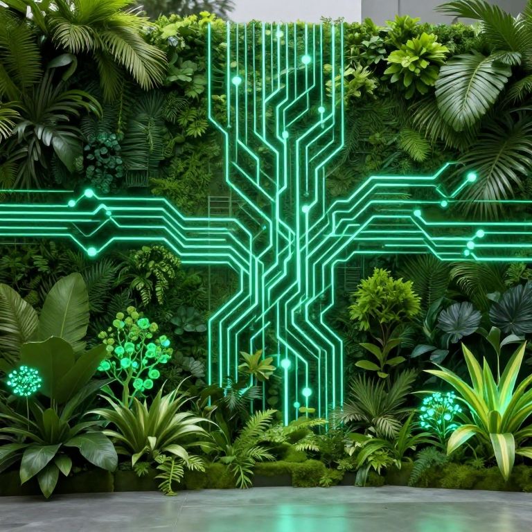 Photograph of a lush green wall with neon circuitry patterns, featuring vibrant glowing lines amidst various tropical plants and foliage.