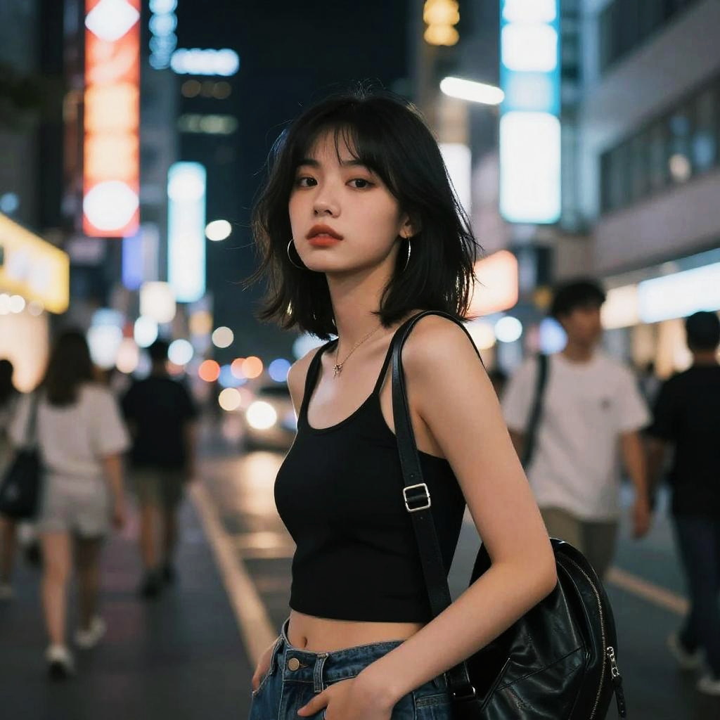 Two girls together on a city rooftop at dusk, neon lights glowing softly around them, casual streetwear fashion, with a panoramic urban skyline and a calm, intimate mood.