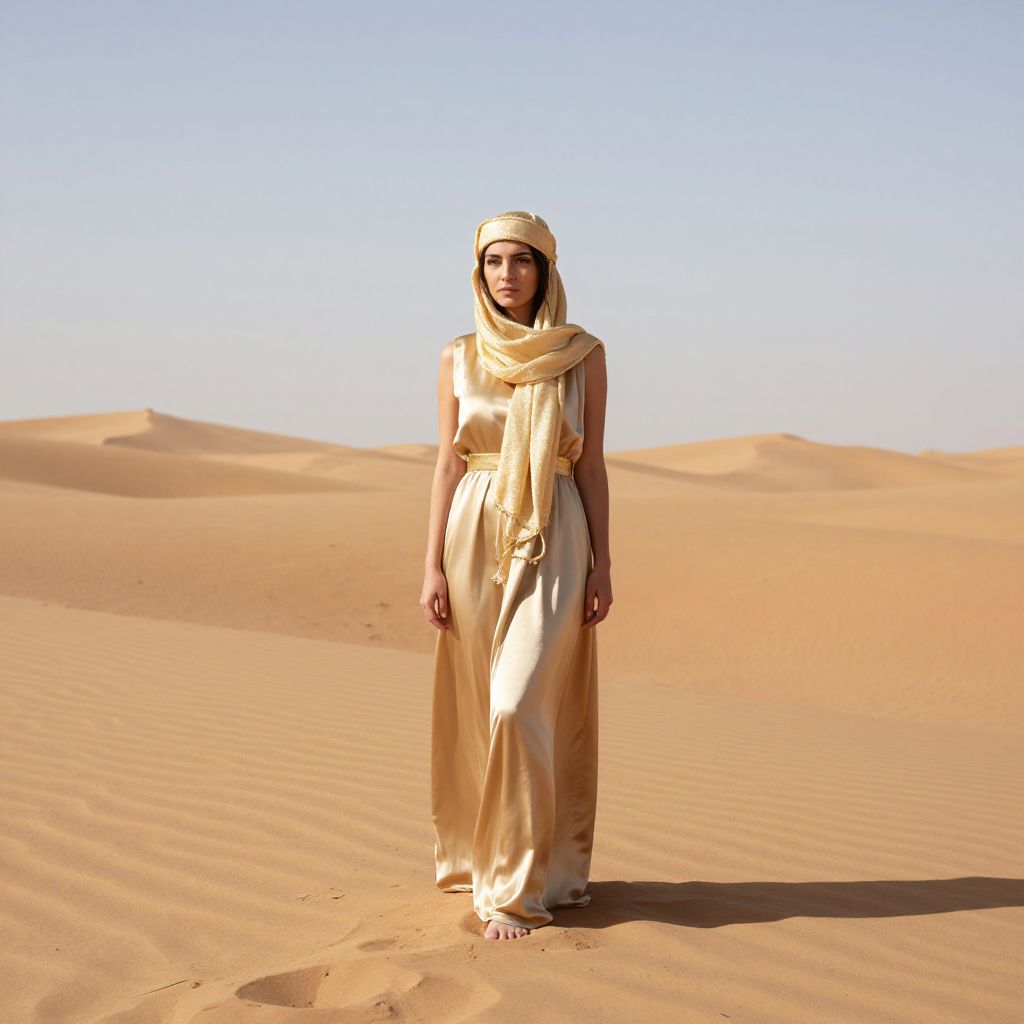 Woman standing in a vast desert landscape, her golden headscarf and matching dress blending seamlessly with the sandy terrain under a clear sky.