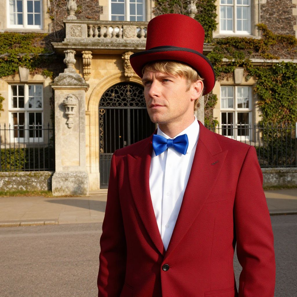 A man with distinctive blonde hair, neatly combed and slightly tousled, stands confidently in front of a grand, historic building with ivy-covered stone walls and a wrought-iron gate. He wears a sharp red suit with a crisp white shirt and a vibrant blue bow tie, completing the look with a polished red top hat that sits slightly tilted on his head. The setting is sunlit with soft golden light casting long shadows, adding depth and warmth to the scene. The atmosphere is elegant and timeless, blending classic fashion with a touch of vintage charm.