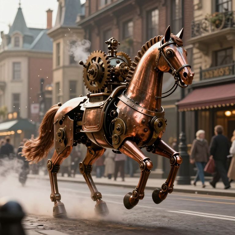 Horselike steampunk automaton trotting through a bustling city street filled with Victorian architecture, gears and copper plating shining, steam and sparks flying, dynamic composition with warm tones and detailed machinery.