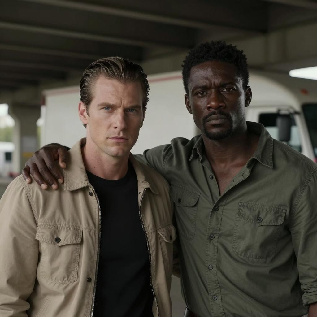 Photograph of two men under a dimly lit overpass. The man on the left has slicked-back dark hair, light skin, and wears a beige jacket over a black shirt. The man on the right has dark skin, short curly hair, and wears a green shirt. The man on the right has a serious expression, with his arm around the shoulder of the man on the left. A white truck with a red stripe is in the background. The scene has a tense, dramatic atmosphere.