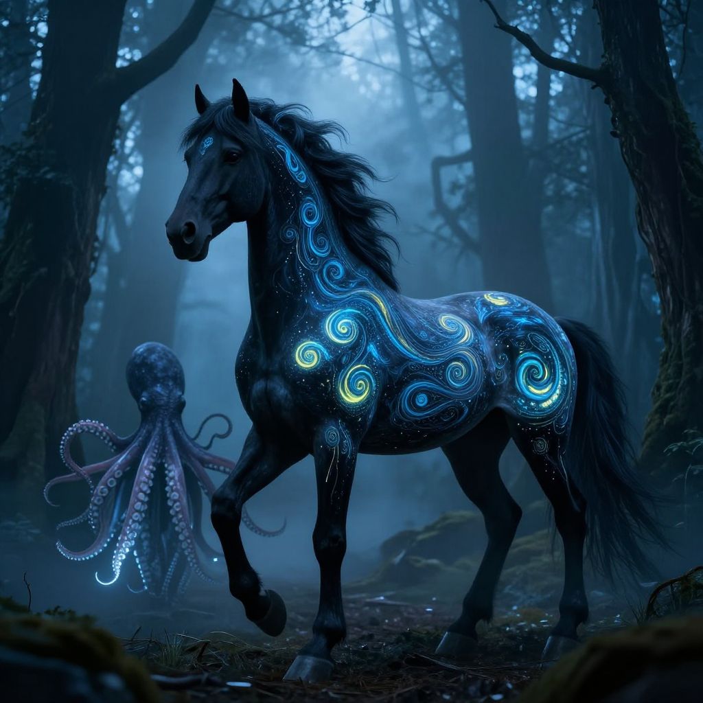 Digital art: A glowing blue-patterned black horse with neon spirals walks through a misty forest, accompanied by a luminescent octopus-like