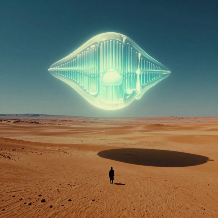 This is a digitally rendered image depicting a vast, desert landscape under a clear, deep blue sky. Dominating the sky is a glowing, futuristic, teardrop-shaped structure with vertical, neon-blue light lines and a bright white core. The structure casts a shadow on the sandy, orange desert below. In the foreground, a single, small, dark silhouette of a person stands facing the structure, emphasizing the enormous scale of the object. The desert is expansive, with gentle dunes and a horizon that meets the sky, creating a sense of isolation and awe.
