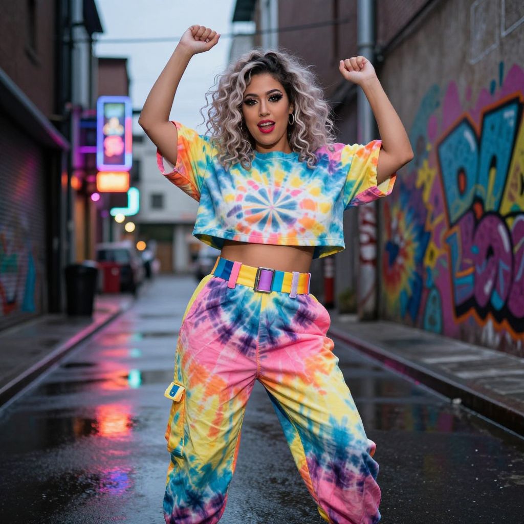 A tie dye woman in a stylized, oversized costume dancing in a neon-lit urban alley during evening, her face has a bold, expressive look with dark eyes and light curls, wearing a tie-dye crop top and high-waisted pants with a wide belt, the city lights reflect on wet pavement and the background shows graffiti art with abstract tie-dye patterns. The woman has big tits and cute face