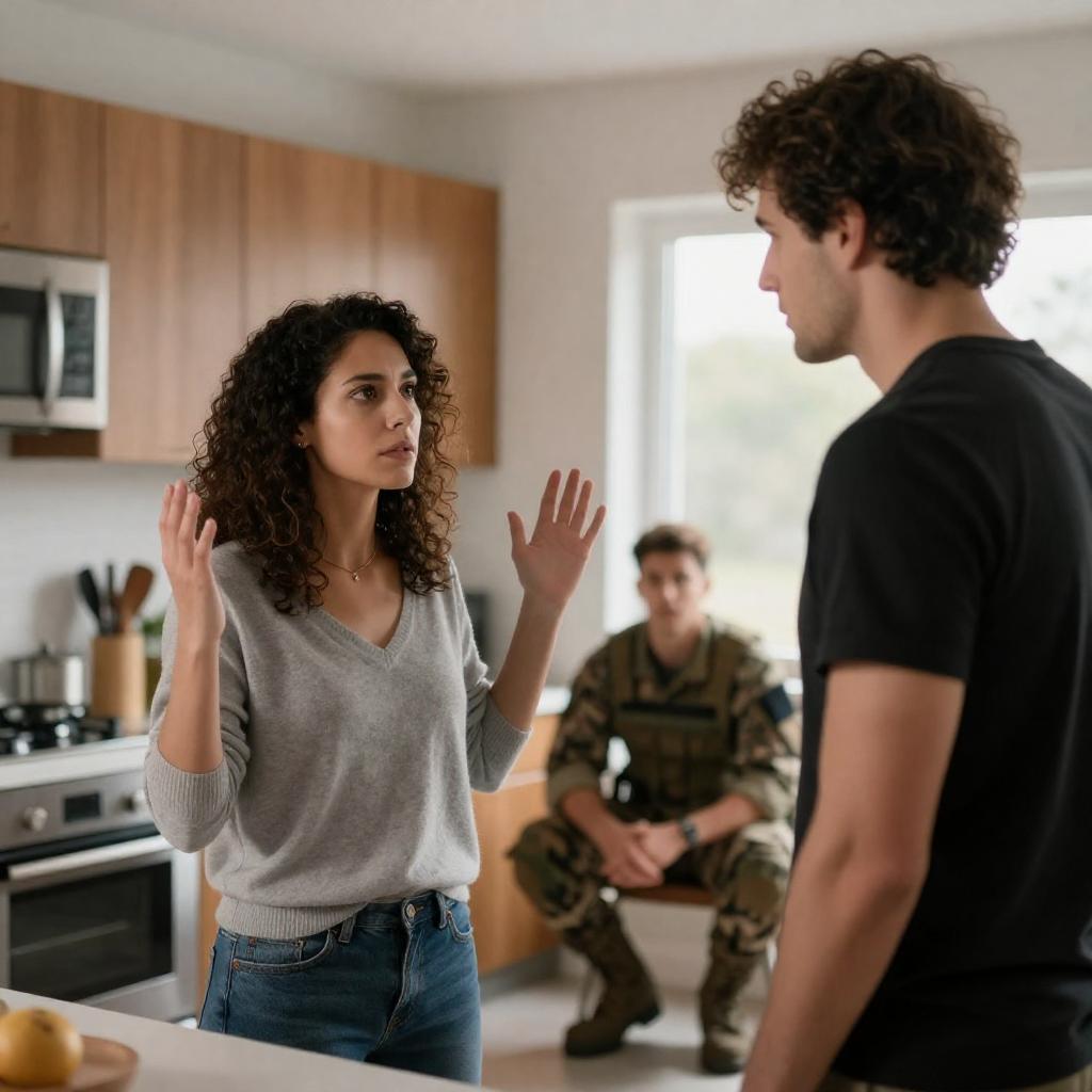 Photograph of a woman with voluminous, curly brown hair and bold makeup, wearing a black lace top, playfully pointing at a young boy with short, platinum blonde hair and a serious expression. The background is a blurred indoor setting with shelves. The right side shows a close-up of the boy's back, highlighting his white, wavy hair.