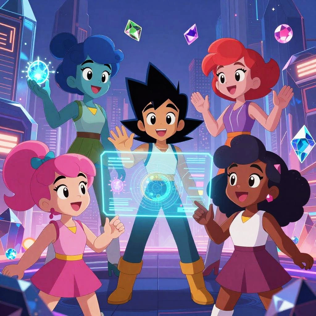 This is a digital cartoon illustration featuring five children with diverse skin tones and hairstyles, standing in a futuristic cityscape with neon lights. The central character, a black-haired boy with spiky hair, wears a white shirt and blue pants, glowing a blue circular energy symbol on his chest. Surrounding him are four children: a blue-haired girl with a bun and green top, a red-haired girl in a purple dress, a pink-haired girl in a pink dress, and a dark-skinned girl with curly hair in a white top and purple skirt. All children are smiling and holding or levitating colorful crystals. The background has tall, illuminated skyscrapers, adding to the sci-fi atmosphere.