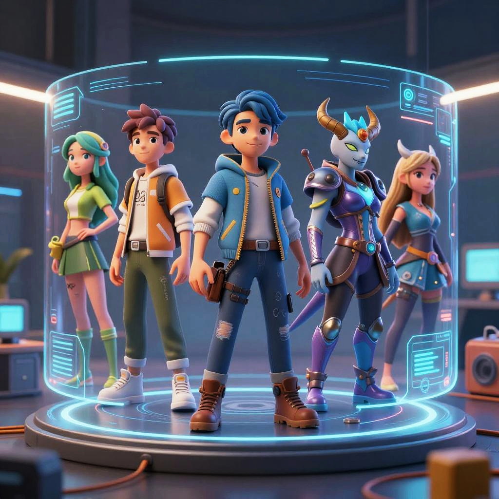 Digital anime-style artwork of five diverse children with colorful hair and clothes, standing in a futuristic city, surrounded by glowing crystals. Central child with black sp