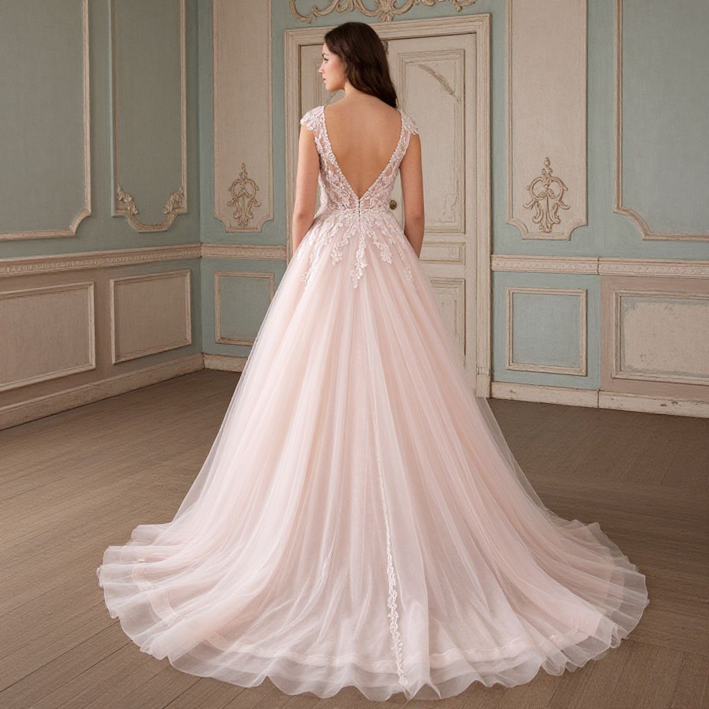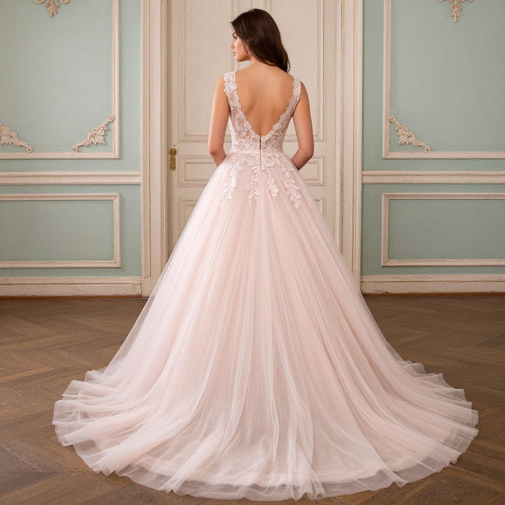 Back view of a woman wearing an elegant light pink tulle long prom dress featuring intricate lace detailing on the back, gracefully flowing into a voluminous skirt that cascades onto the floor, set against a vintage-inspired room with pastel walls and ornate architectural details.