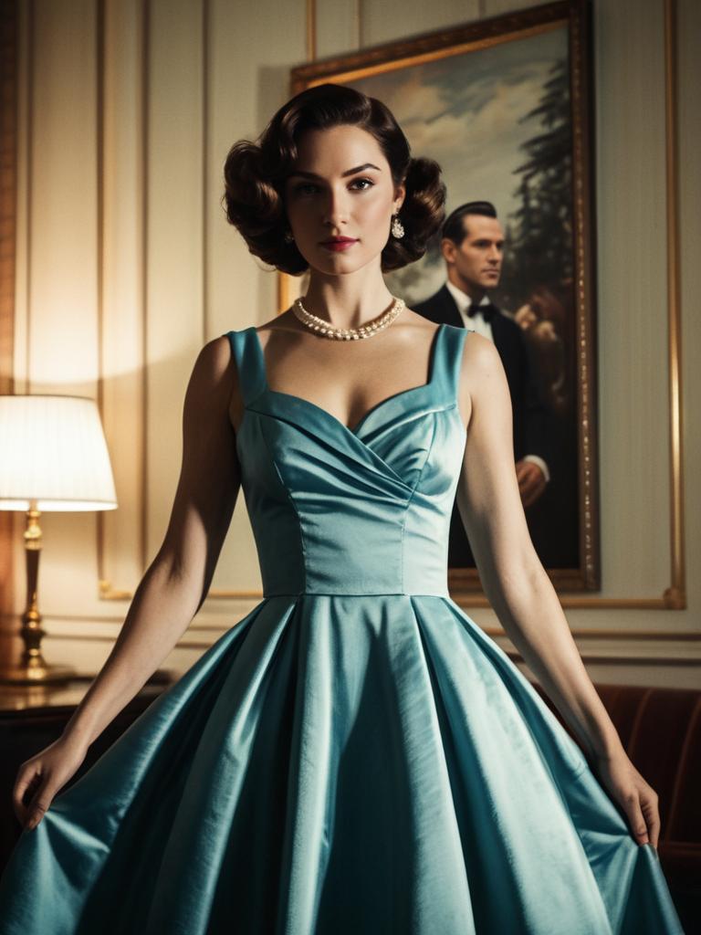 Woman in Retro Party Dress, cinematic realism, glamorous vintage portrait --sref 1400