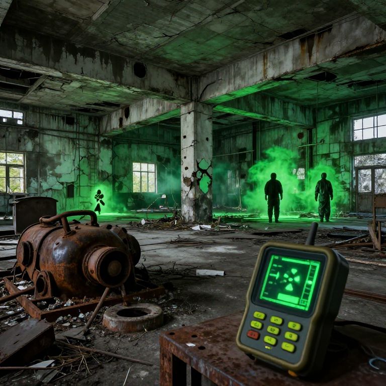 Tarkov radiation area, abandoned industrial site with radioactive contamination, cracked concrete, rusted machinery, flickering geiger counter readings, shadowy figures in hazmat suits exploring, vivid green radiation effects, realistic dystopian atmosphere