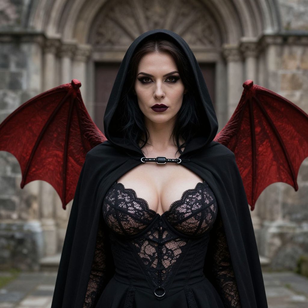 Photorealistic image of a pale woman with dark hair, black lace corset, red bat wings, and hooded cloak, standing in front of