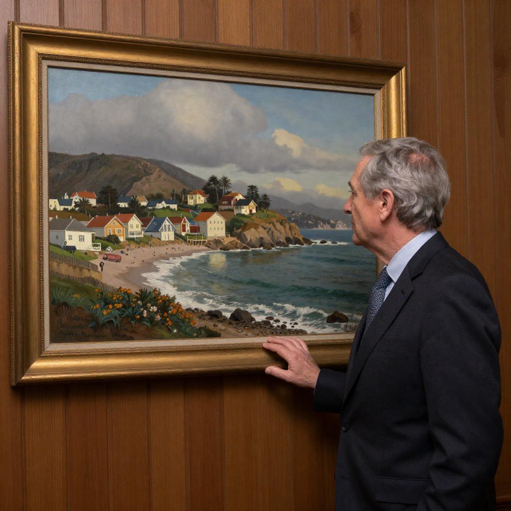 Photograph of an older man with gray hair dressed in a dark suit and tie, standing beside and looking intently at a framed painting of a coastal town. The painting depicts a scenic view of San Francisco in May, featuring colorful houses on a hillside, a beach, waves, rocky shore, and a cloudy sky with mountains in the background. The setting includes a wooden paneled wall behind the man and the painting.