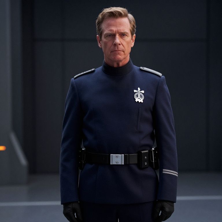Photograph of a stern-looking middle-aged white man with short, light brown hair, standing in a dimly lit, futuristic background. He is wearing a dark navy blue military-style uniform with white insignia on the left chest, black gloves, and a black belt with a silver buckle. The uniform has white stripes on the sleeves. The background is blurred but appears to be a dark, metallic, industrial setting with subtle lighting. The man's expression is serious and focused, and he stands centrally in the frame, facing the camera directly.