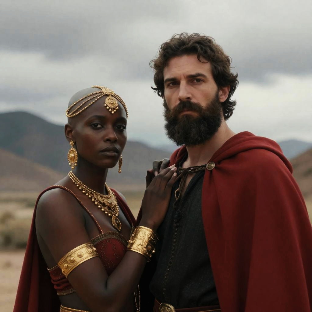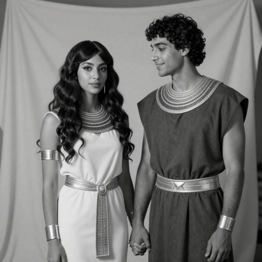 Photograph of a Roman-style scene with a dark-skinned woman in a red toga and gold crown, standing opposite a light-skinned man in a green toga with gold trim. They hold hands, standing in a richly decorated room with ornate gold curtains, a brass ewer, and a fur rug on the floor.