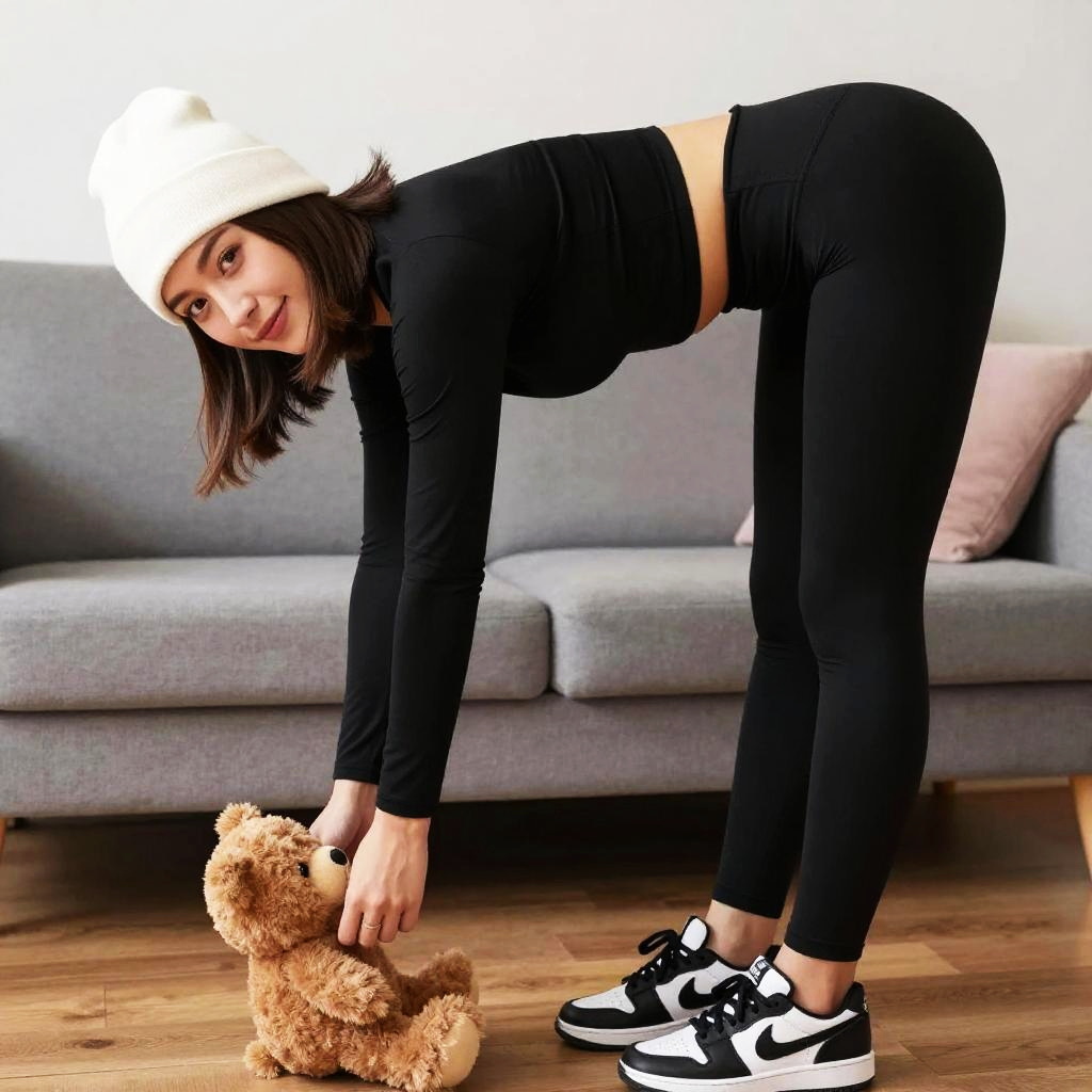 Photograph of a young woman with medium-length brown hair, wearing a white knit beanie, black long-sleeve top, and black leggings that emphasize her curvy buttocks. She's bending over, looking back at the camera with a slight smile, while picking up a small brown teddy bear on a wooden floor. She's also wearing black and white sneakers. The background shows a gray couch with a pink blanket and a white wall.