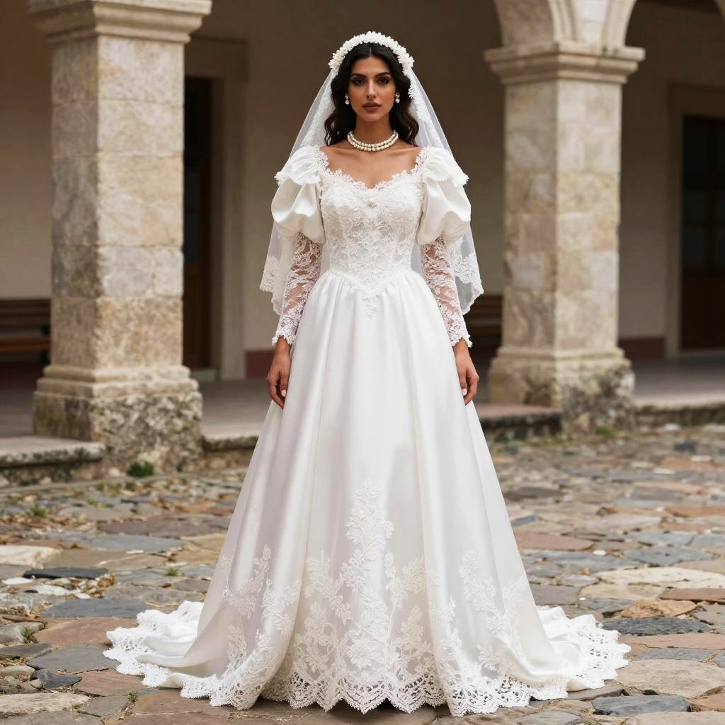 Photograph of a beautiful woman with long, wavy black hair standing in a grand, Gothic-style cathedral. She's wearing an elegant, white lace wedding gown with a deep V-neck and long sleeves, paired with a flowing veil. The cathedral's tall, arched windows and colorful stained glass create a warm, illuminated backdrop. The lighting highlights the intricate lace details of her dress.