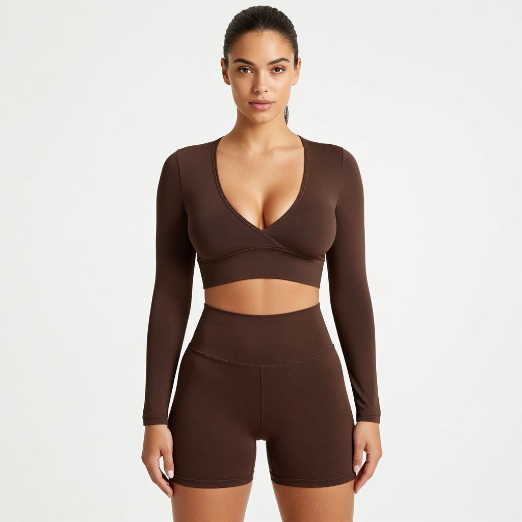 "Woman, athletic chic, chocolate brown crop top with long sleeves and deep V-neck, matching high-waisted bike shorts, minimalistic design, white background. Sexy. Pretty face and beаutiful eyes. Big breasts."