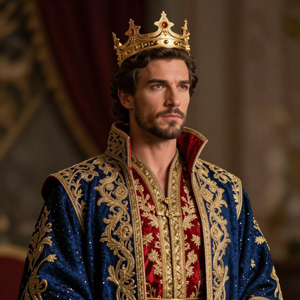 A majestic, handsome man with a regal bearing, sporting a golden crown on his head, is depicted wearing an elaborate blue and red outfit richly adorned with intricate gold embroidery. The lighting should be dramatic, highlighting the luxurious textures of his clothing.