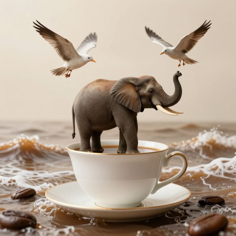 Amidst the boundless expanse of turbulent coffee seas, an elephant stands serenely atop a teacup, guided by a soaring bird, embodying the delicate balance of vulnerability and freedom, while the gentle rustle of wings and the distant roar of waves weave a symphony of existential wonder.