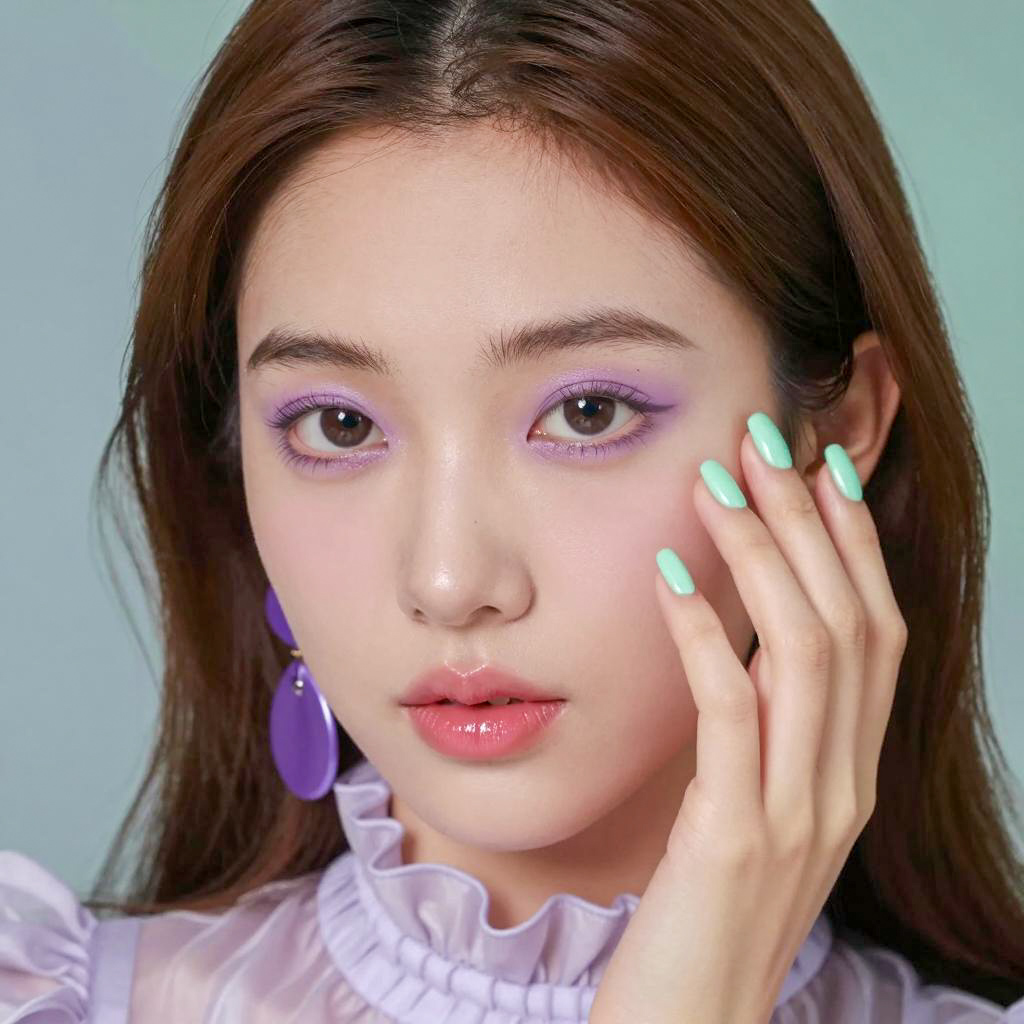 Photograph of a woman with fair skin, brown hair, and intense gaze. She wears purple eyeshadow, mint green nails, pink glossy lips, and large purple earrings. Her right hand touches her face. She has a light purple ruffled collar. Background is blurred blue and green. She looks slightly to the left.