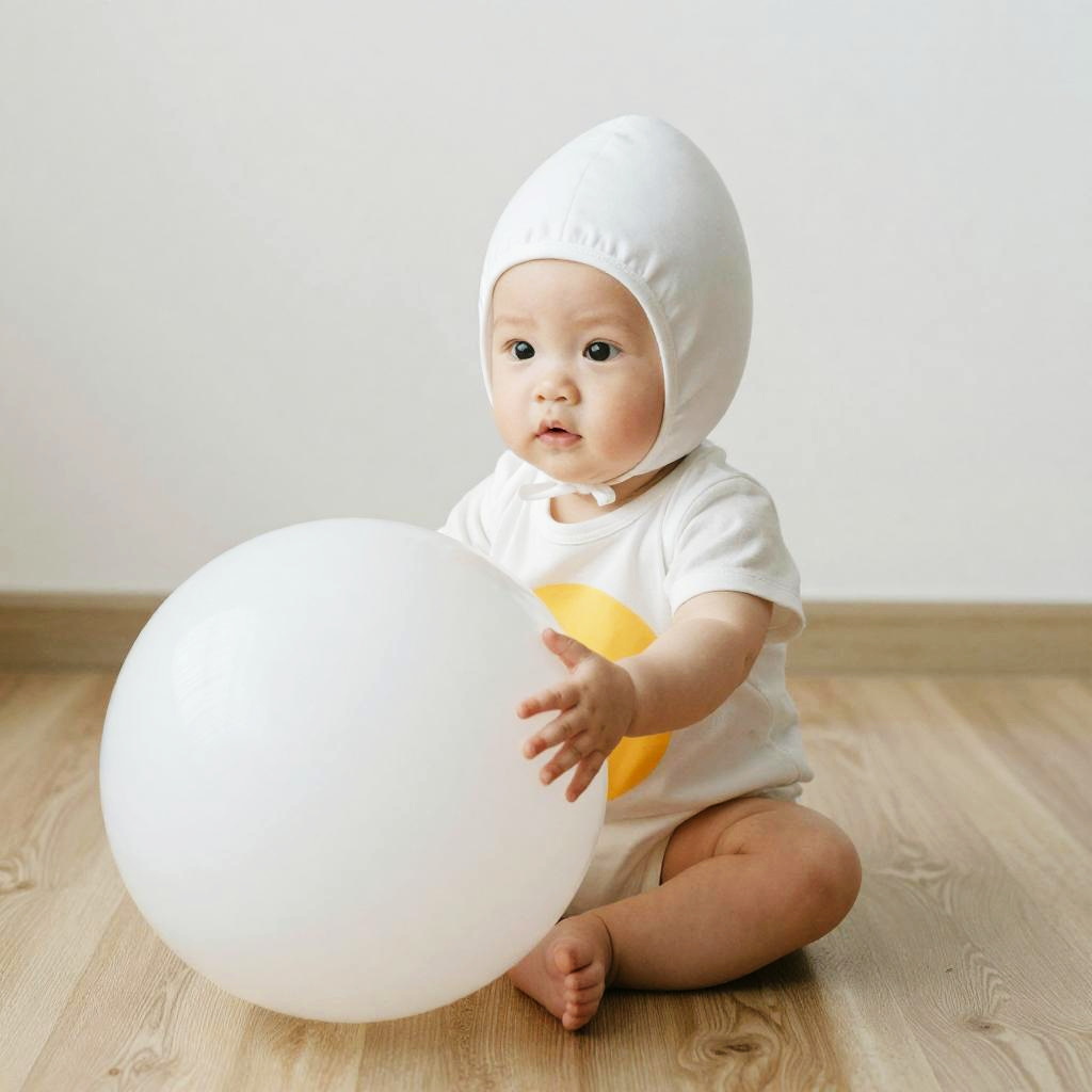 Cute Asian baby wearing a white egg-shaped costume hat and white sleeveless outfit, sitting on the floor and holding a large white ball. The baby is posed against a plain white background, emphasizing the minimalist and playful theme.