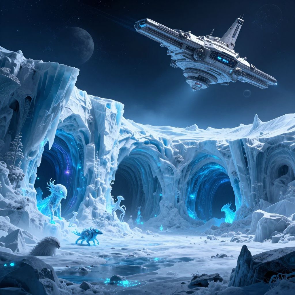 AI planet generator crafting a frozen ice planet with giant glaciers, intricate ice caves glowing with neon lights, frozen alien creatures, and a massive space station orbiting above, high-resolution digital painting with science fiction elements.