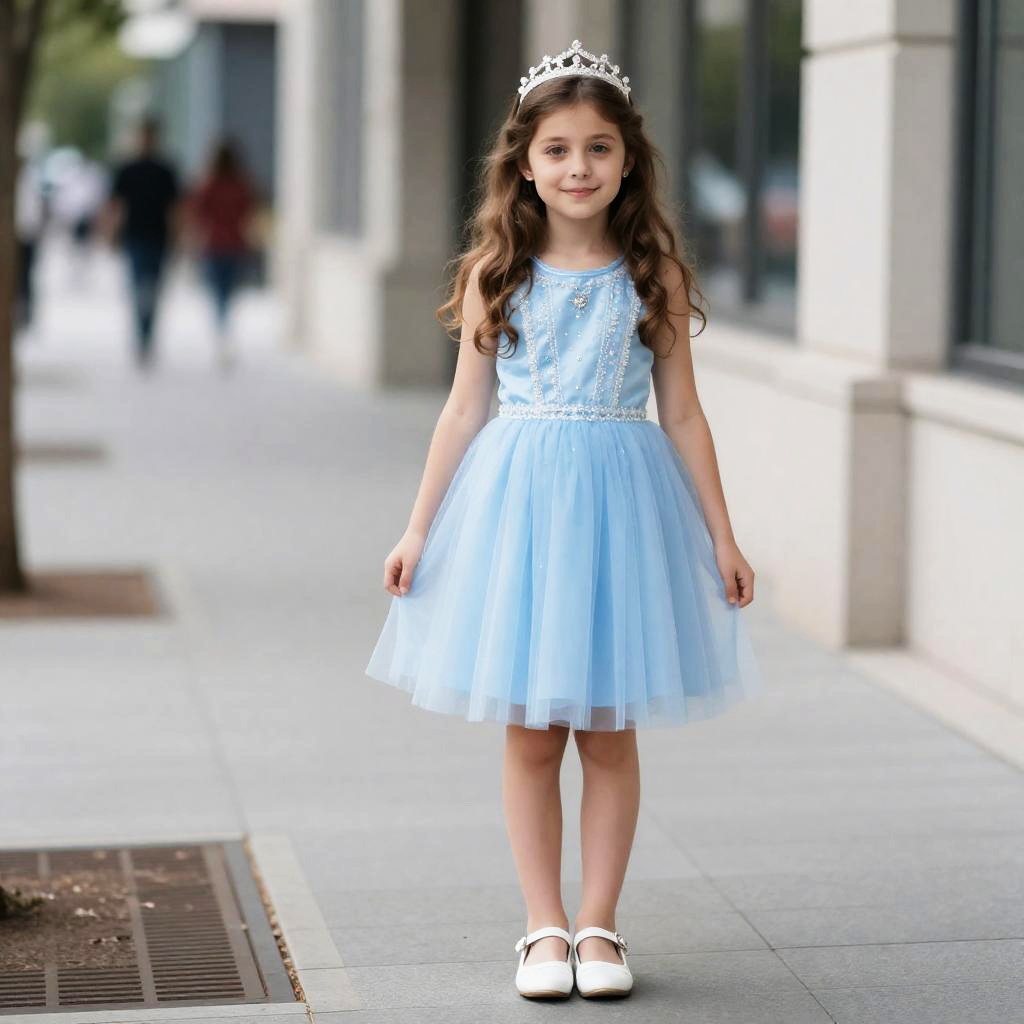 One Year Birthday Photoshoot, a woman in a blue dress standing on a sidewalk