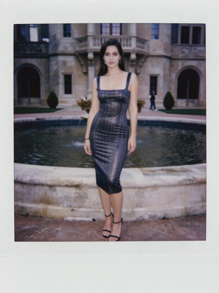 A petite woman in evening wear, a body-hugging midi dress with metallic stripes and a side slit, paired with black strappy high heels, stands in a castle courtyard with a water feature. Captured in the style of a polaroid instant camera. Sexy. Pretty face and beаutiful eyes. Big breasts