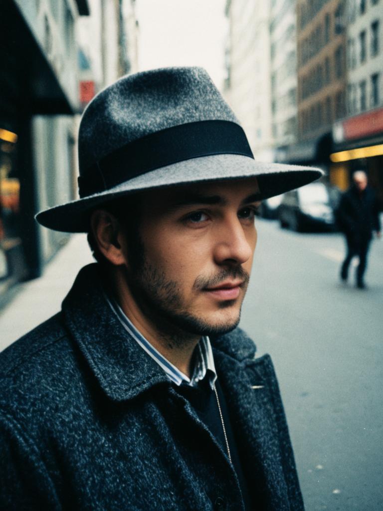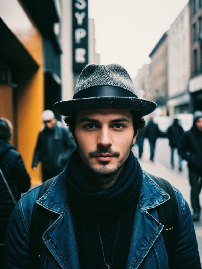 Person wearing a Hat, candid street-style portrait, cinematic tones
