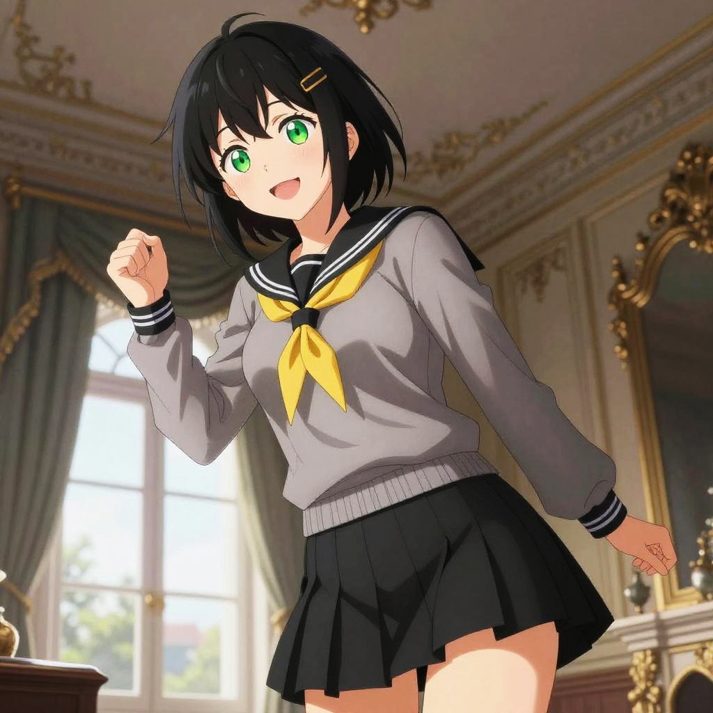 (masterpiece:1.2), best quality, ultra high res, unity 8k wallpaper, (illustration:1.0), (beautiful detailed eyes:1.6), extremely detailed face, Cinematic lighting, high contrast, clear color, (perfect hands, perfect anatomy), (dynamic angle and pose:1.3), best angle, (1girl, solo:1.5), smooth, simple, kirigaya suguha, large breasts, hairclip, thighs, black hair, green eyes, short hair, blunt bangs, bob cut, school uniform, skirt, pleated skirt, sailor collar, black skirt, serafuku, long sleeves, neckerchief, (gray sweater, sweater:1.2), black sailor collar, yellow neckerchief, smile, happy, seductive smile, (luxurious mansion:1.4), (indoor:1.2), (window:1.3), (curtain:1.2), (from_below:1.4)