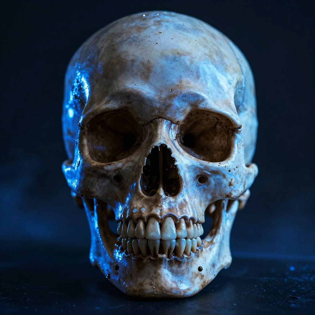 Front facing skull illuminated by eerie blue neon light, intricate bone texture, dark smoky background, hyper-realistic detail, cinematic atmosphere, 8k resolution