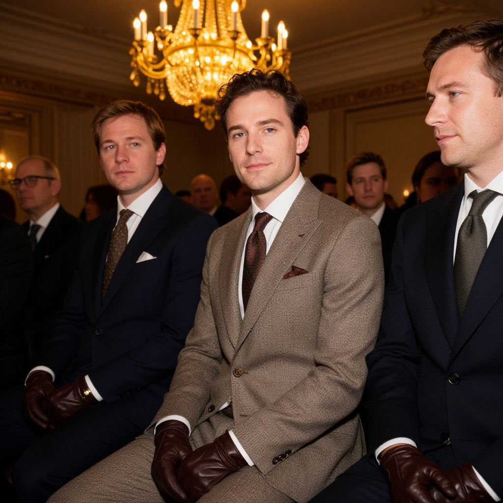 A stylish prompt for men in suit gathered at a high-end event under a golden chandelier, elegant leather gloves, subtle smiles, warm lighting, rich textures of premium wool and silk, refined luxury vibe.