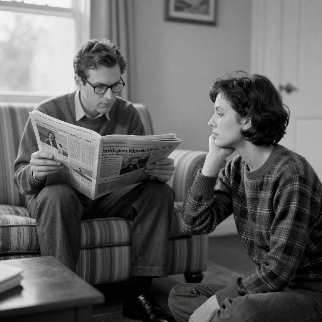 Black and white photograph of two people in a living room. A man with glasses and dark hair, wearing a sweater, reads a newspaper while seated on a striped couch. A woman with short dark hair, in a plaid sweater, sits on the floor, resting her chin on her hand, looking at the man. Background includes a window and door.