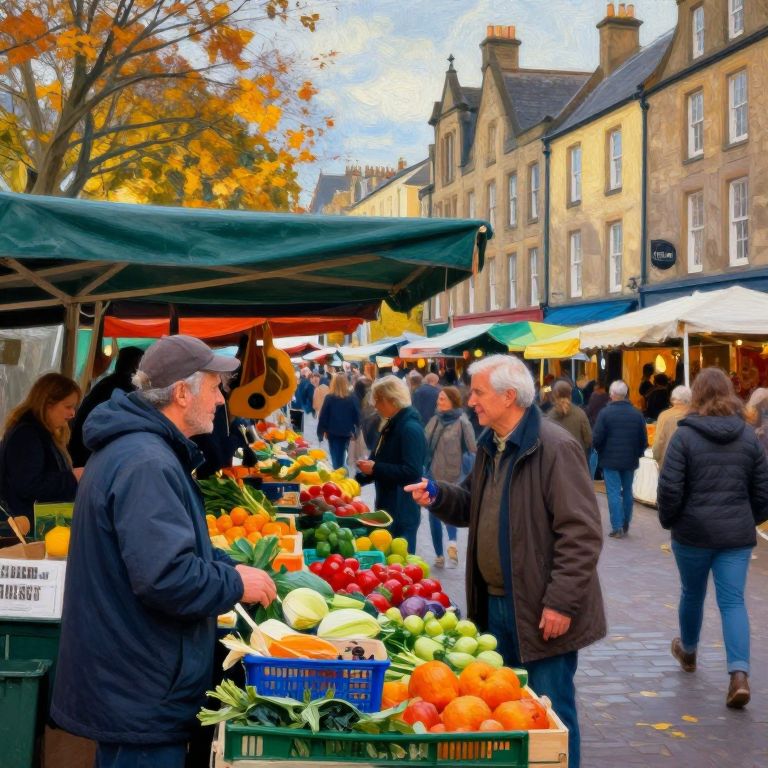 Santander street market scene filled with colorful stalls, lively crowd shopping fresh local produce, merchants engaging warmly, historic buildings in background, autumn season with golden light, impressionist art style