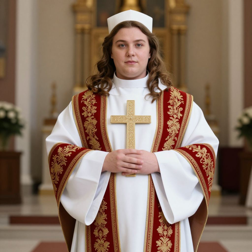 Plus Size Pious Priest Costume, priest in white robe and red and gold stole holding a cross