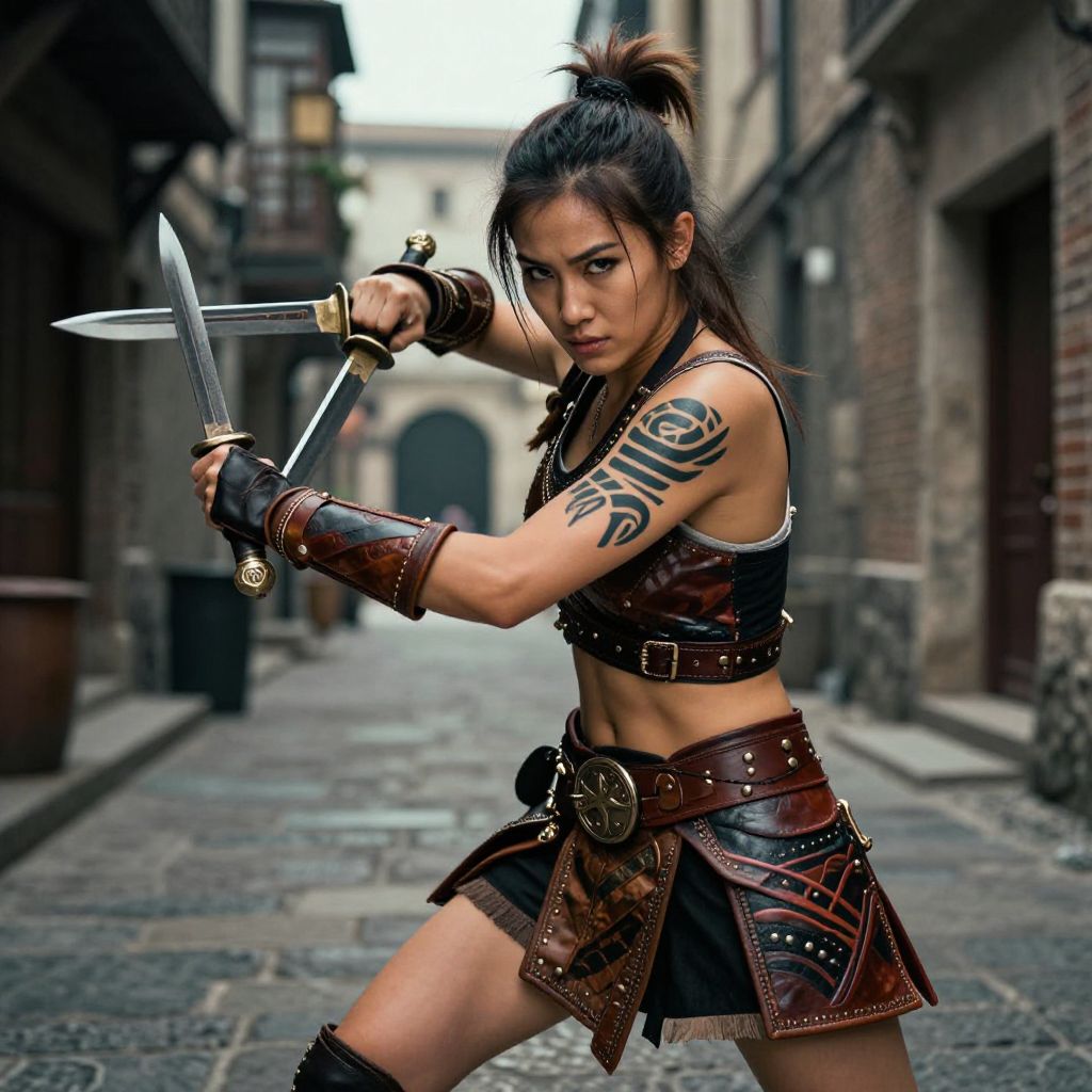 Photograph of an intense, tattooed Asian woman with black hair in a bun, wielding dual knives in a medieval stone alley. She wears a leather