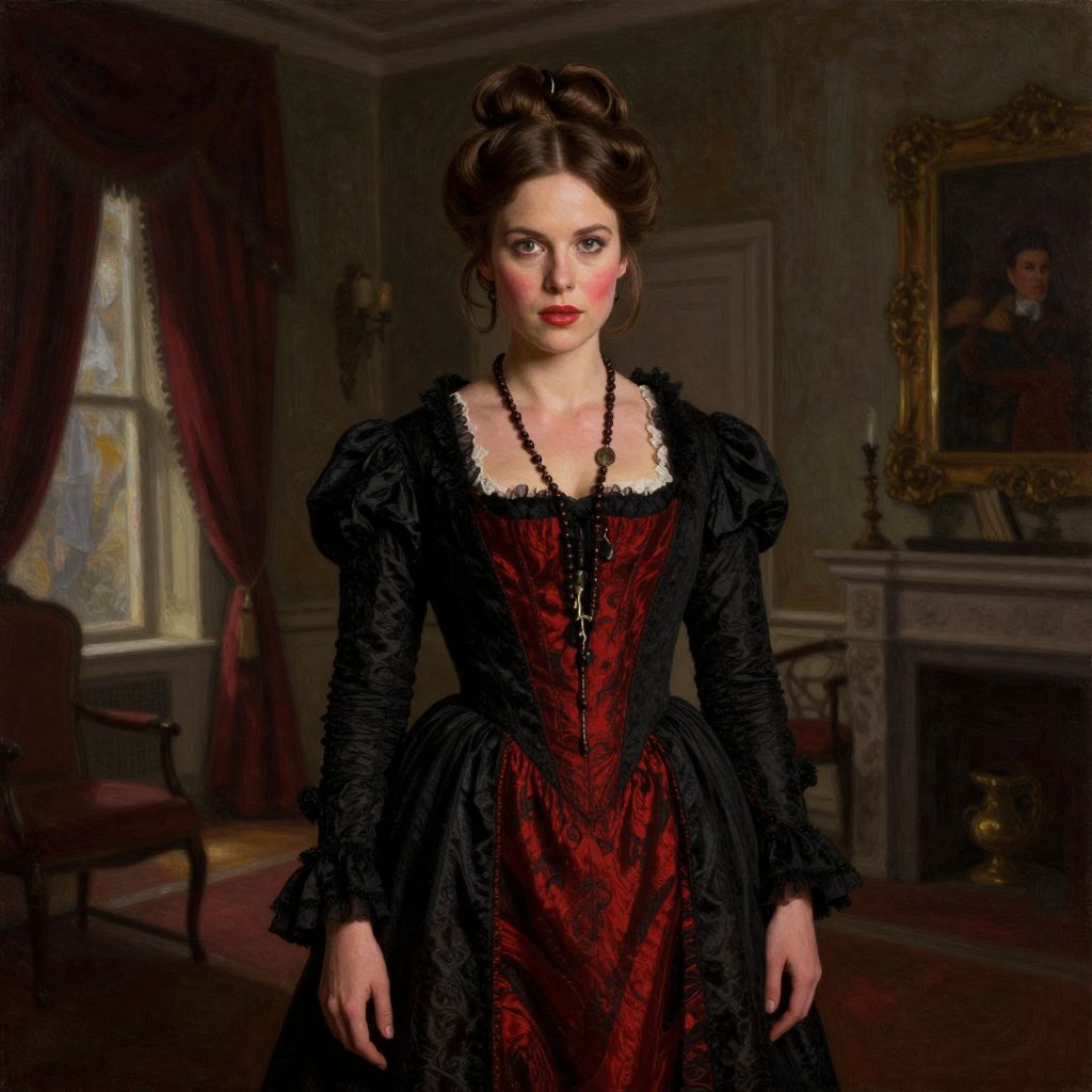 Photorealistic digital artwork of a young woman with fair skin and dark brown hair styled in an elaborate updo. She wears a Victorian-style black and red corset dress with puffed sleeves, black lace trim, and a black bead necklace. Her red lips and pale makeup contrast with her dark dress. She stands in a dimly lit, ornately decorated room with green wallpaper, a red curtain, a fireplace with a gold-framed portrait above, and a wooden chair to the left. The mood is Gothic and elegant, with rich, dark colors dominating the scene.
