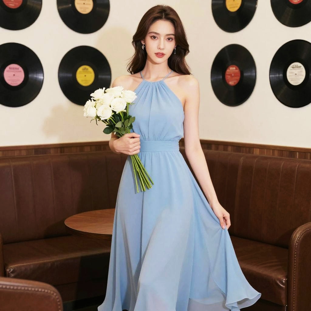 A Slim woman in a soft blue chiffon maxi dress, sleeveless with a halter neckline, holding a small bouquet of white flowers, stands in a vintage lounge with vinyl records, illustrated in an image comics style. Sexy. Pretty face and beutiful eyes