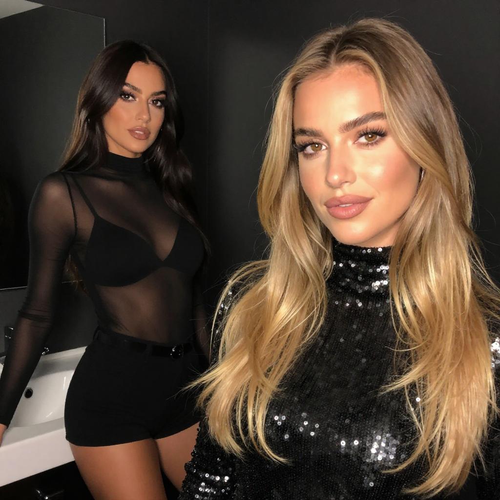 Photograph of two women on stage. The front woman has long, wavy blonde hair, wears a black, sequined, long-sleeve dress, and holds a microphone. The background woman, partially obscured, wears a sheer black top and high-cut black bottoms. Both have confident, poised expressions. The dark background contrasts with their outfits, highlighting their presence.