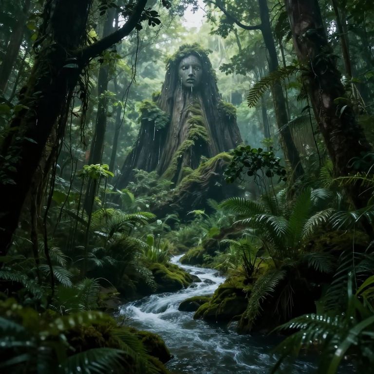 Photograph of a stunning waterfall cascading over a large, carved stone face with pronounced features, including large eyes, a nose, and lips. The face, reminiscent of a classical sculpture, is centered between two tall, rocky cliffs covered in greenery. White water flows down the face, creating mist at the base. The water below is turquoise and turbulent. The scene is set in a lush, tropical environment with dense foliage at the top and sides. The sky is overcast, adding a cool, misty ambiance to the image.