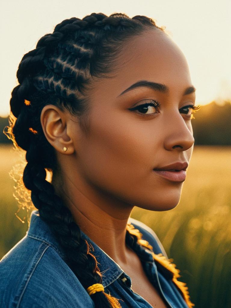 Woman in Tracee Ellis Ross Braided Hairstyle, photorealistic outdoor portrait, golden hour