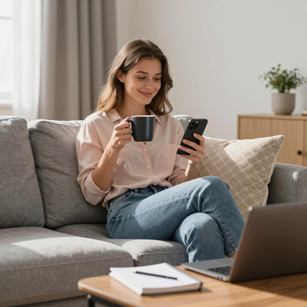 A young woman sitting comfortably on a modern gray sofa in a cozy living room, holding a black coffee mug in one hand and a smartphone in the other, smiling and looking at the phone, wearing a light pink shirt and blue jeans, a beige patterned cushion beside her, a wooden coffee table with a closed notebook and a laptop in front of her, warm natural sunlight coming through the window with beige curtains, soft and relaxed atmosphere
