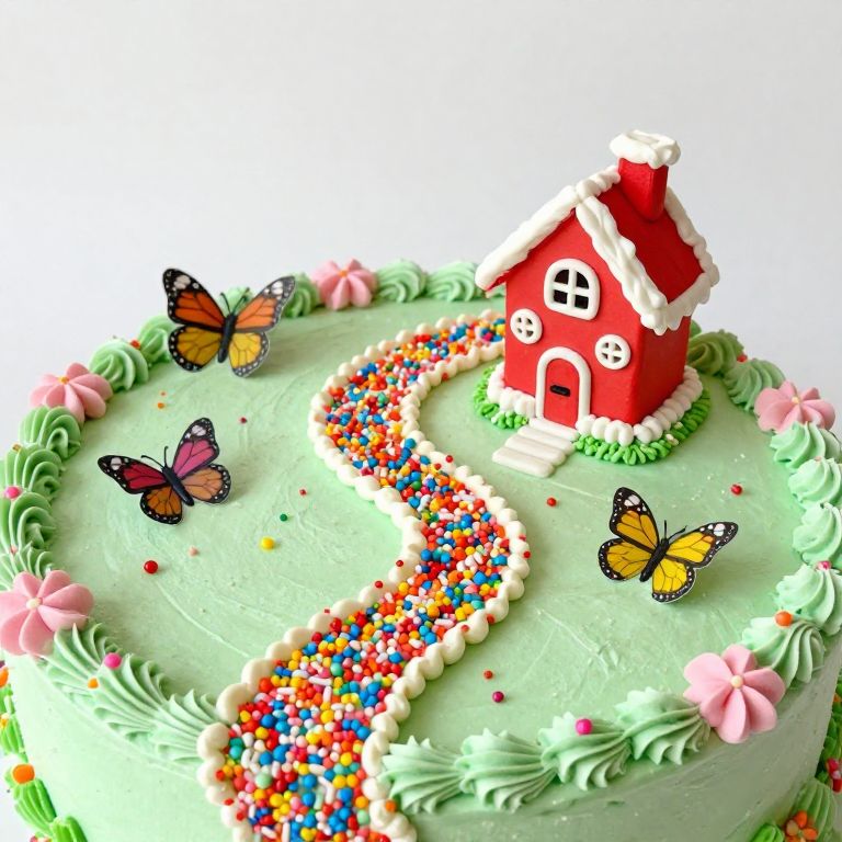 A whimsical birthday cake transformed into a vibrant Candy Land adventure, featuring a winding path of colorful sprinkles, playful butterflies, and a cheerful red house, all encased in a dreamy landscape of green frosting and pink floral accents.