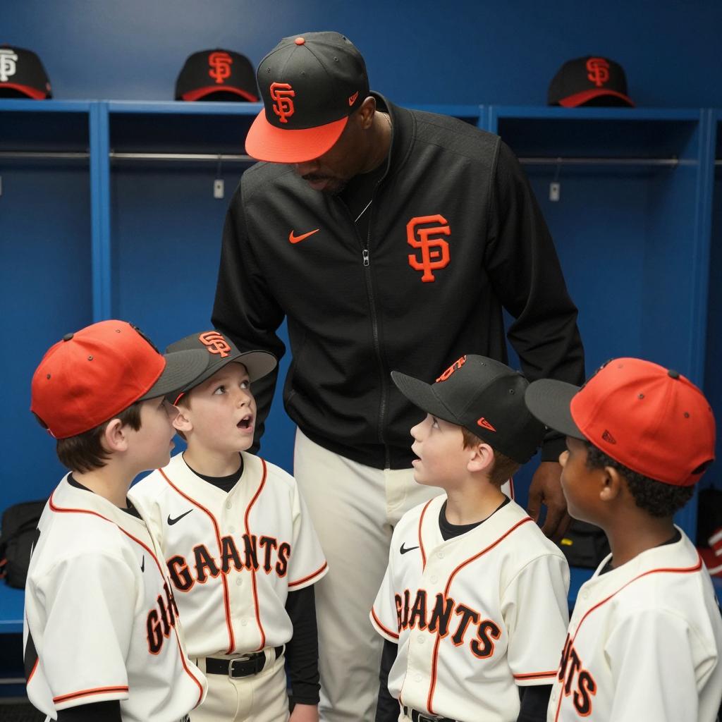 A baseball team locker room. A tall black man in a San Francisco Giants jacket and cap leans over, speaking to three young boys wearing white Giants jerseys and red and black caps. The boys look up at him, one with mouth open. Blue locker room wall in background, several hats hanging. Five people, intense expressions.