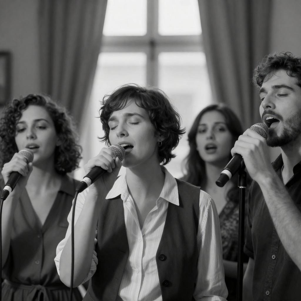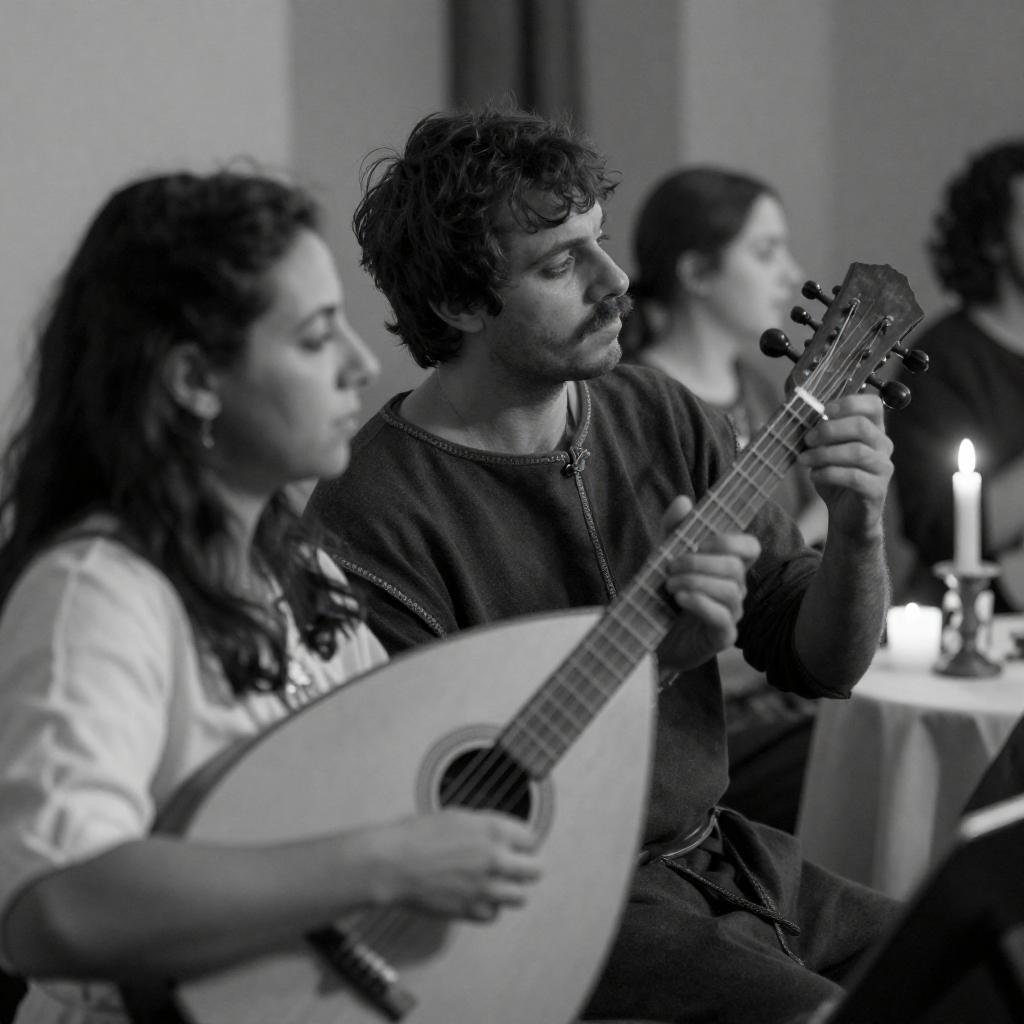 Black and white photograph of a man and woman playing string instruments indoors. Man with dark hair, mustache, wearing a medieval-style shirt, playing a lute. Woman with dark hair, white blouse, holding a similar instrument. Background with other people, candles, and tables. Intense expressions on both faces. Man's right hand on lute's neck, woman's hand near her instrument. Dimly lit room.