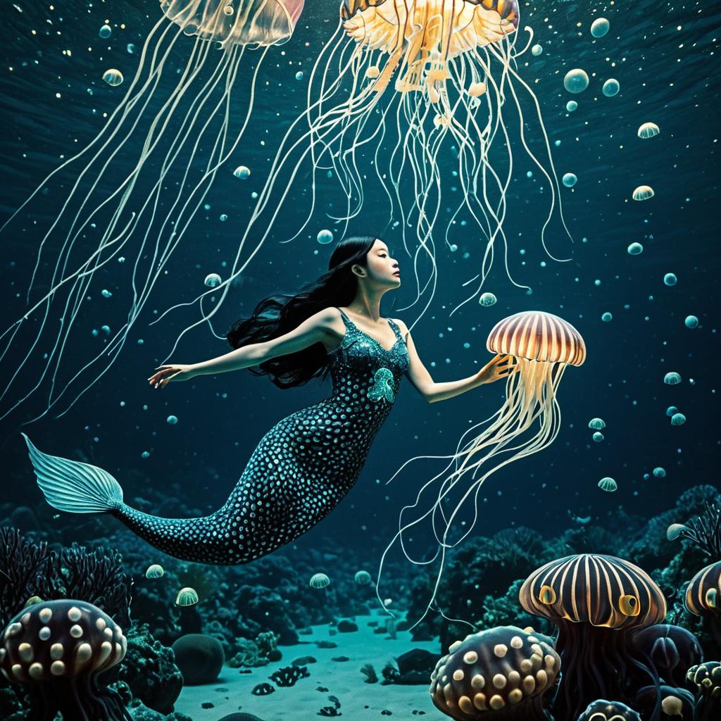 Lowbrow art of a floating jellyfish holding balloons, influenced by James Jean, with a dreamy cloudscape with pastel colors, soft lighting, whimsical and surreal