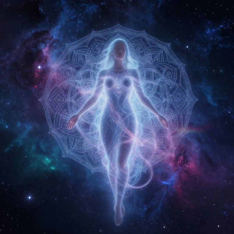 Digital artwork of a glowing, ethereal woman with flowing hair, illuminated by intricate, mandala-like patterns, floating in a starry, cosmic background
