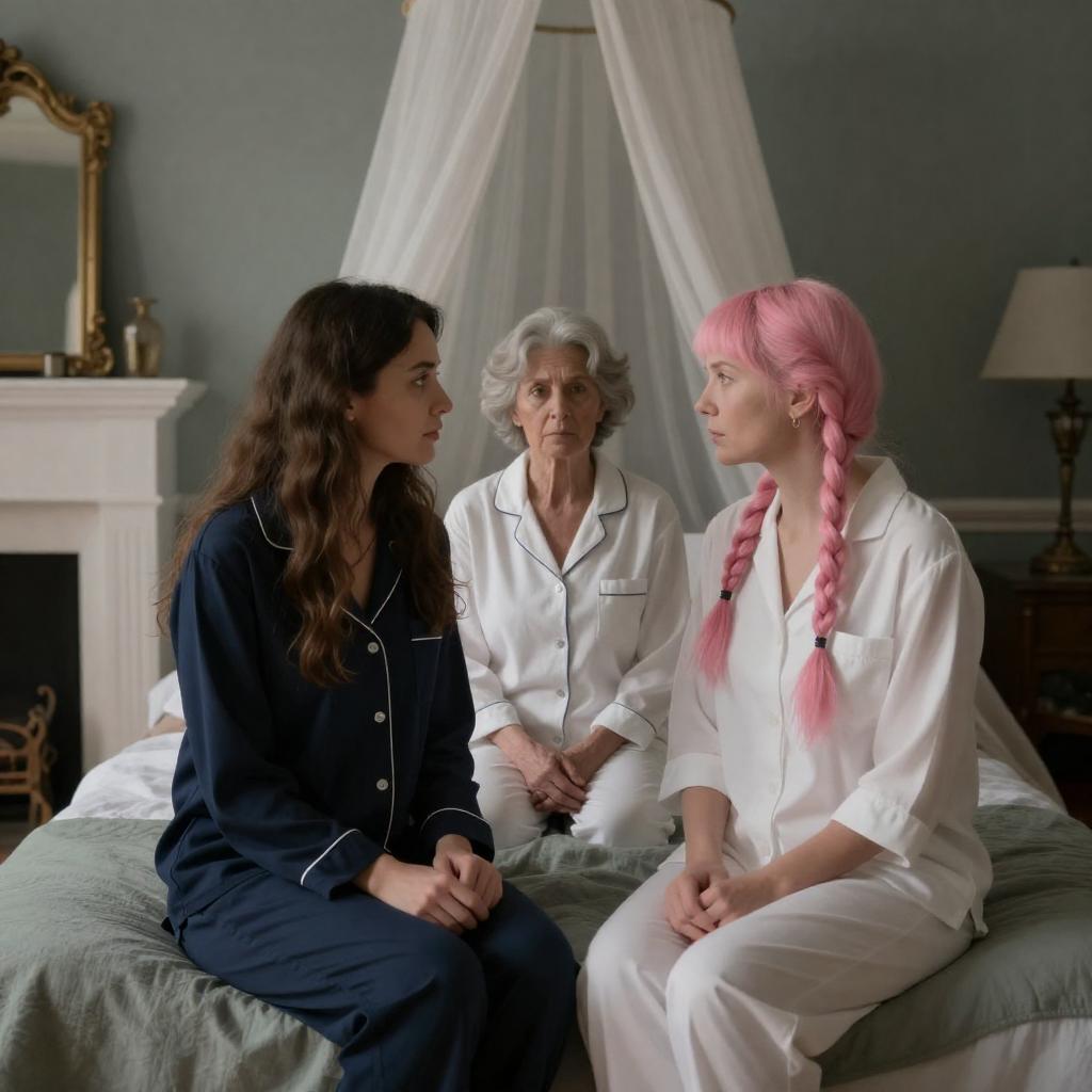 Two women in vintage clothing sit in an ornate room by a marble fireplace. Older woman with gray hair and blue dress, holding a cane. Younger woman with short black hair and black dress, holding a teacup. Both serious expressions.