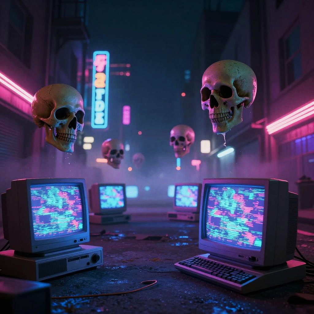 Vaporwave horror scene with neon-lit abandoned city streets, eerie fog, glitching retro computer screens, and distorted pastel skulls floating amidst vintage 80s aesthetics, evoking a surreal nightmare blend of nostalgia and terror.